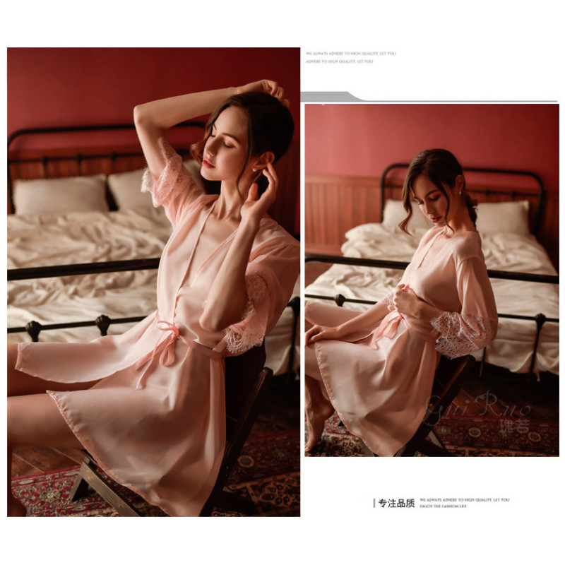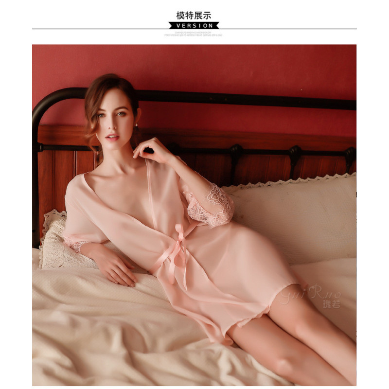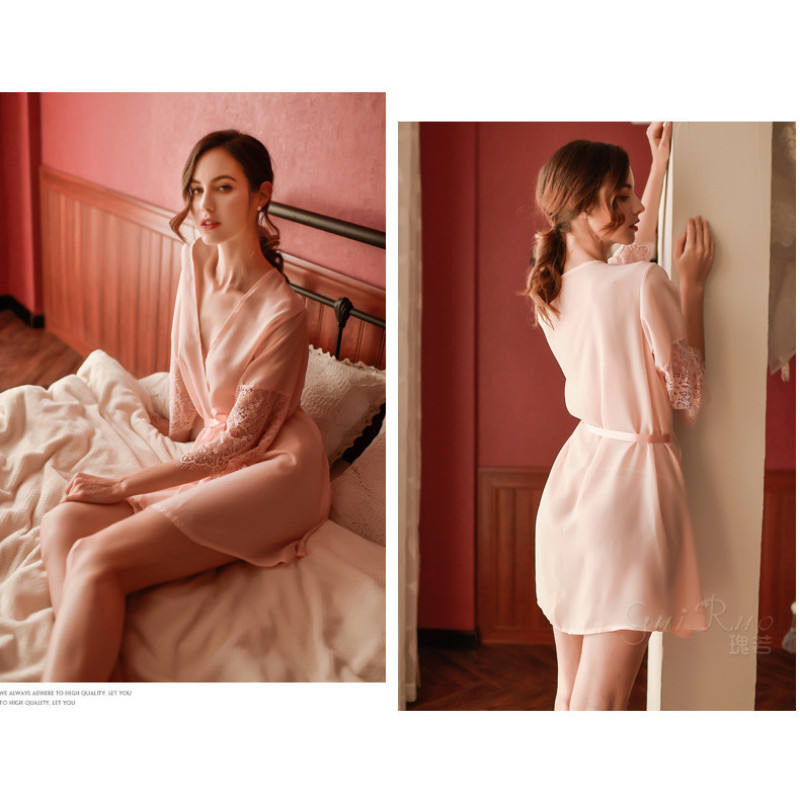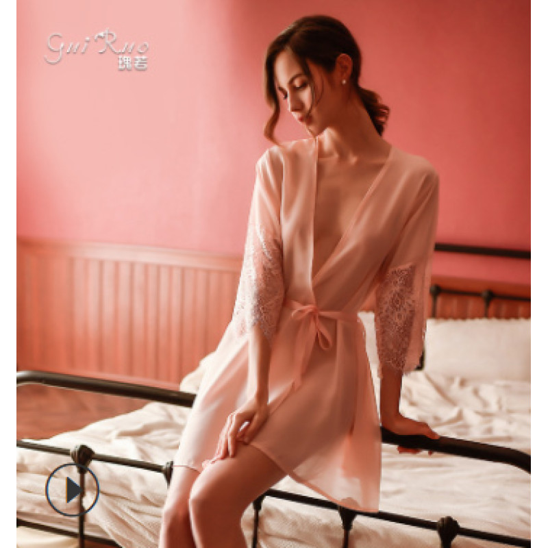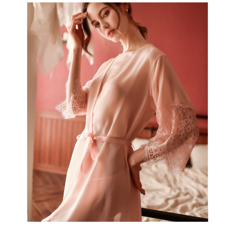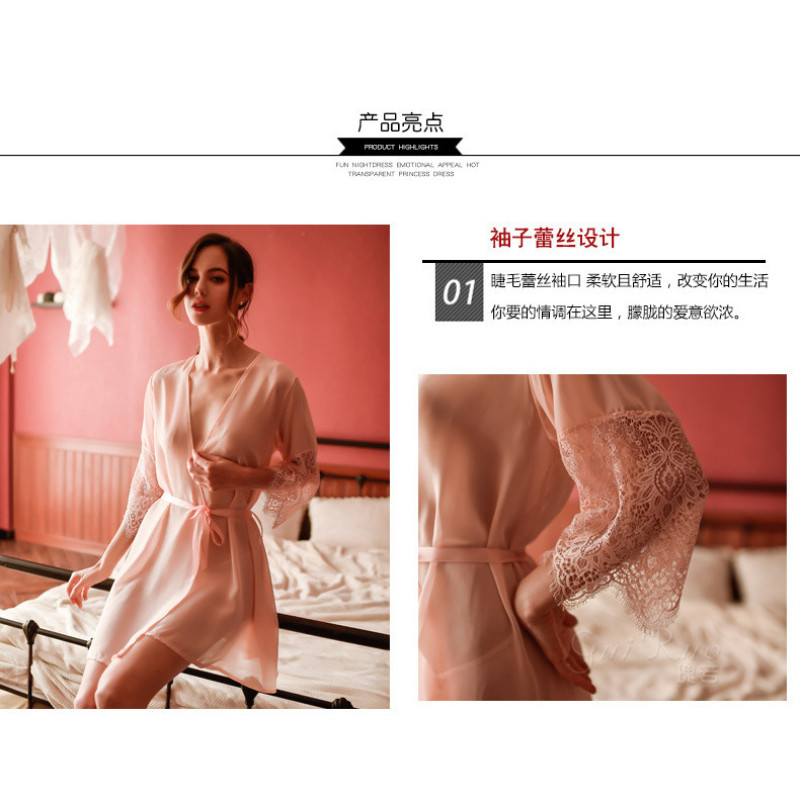 Кружевной халат с кружевными рукавами. Халат выполнен из качественного, мягкого, очень приятного к телу материала. Цвет черный, белый, бледно-розовый. Комплектация: халат, пояс, стринги.